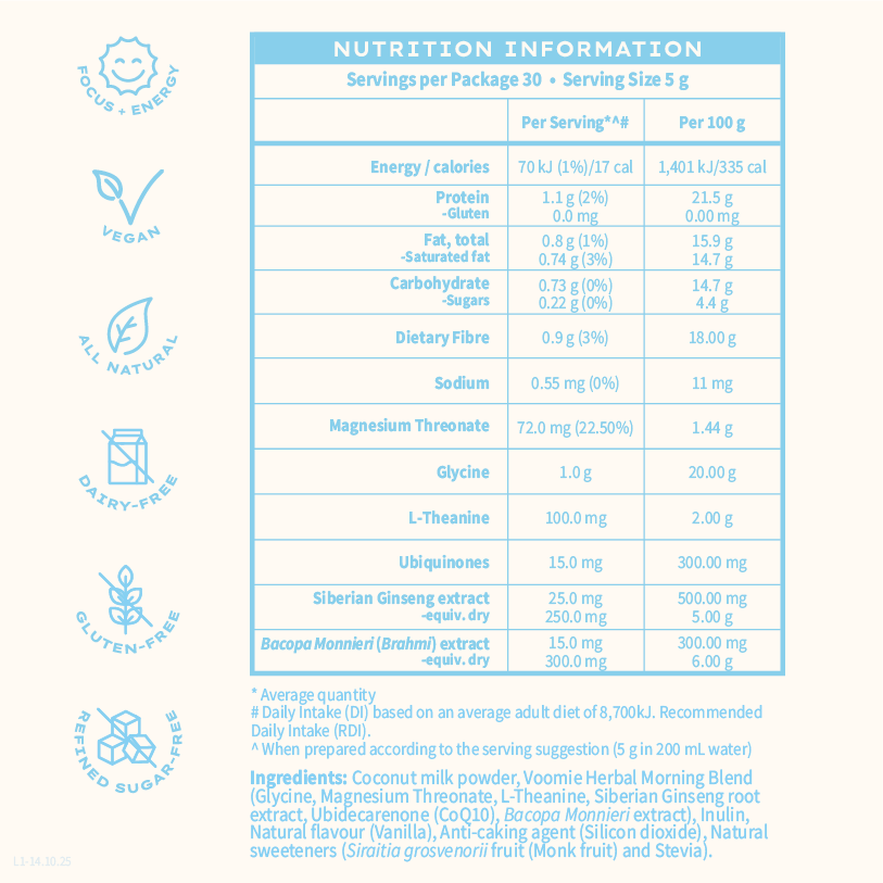 Voomie Flow Fuel contains a blend of ingredients including Magnesium Threonate, Bacopa Monnieri, L-Theanine, Siberian Ginseng, Coenzyme Q10, Glycine and Inulin. These Ingredients have been chosen for their potential benefits in improving focus, energy cognitive function, and overall brain health.