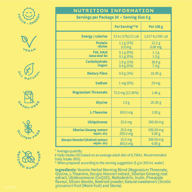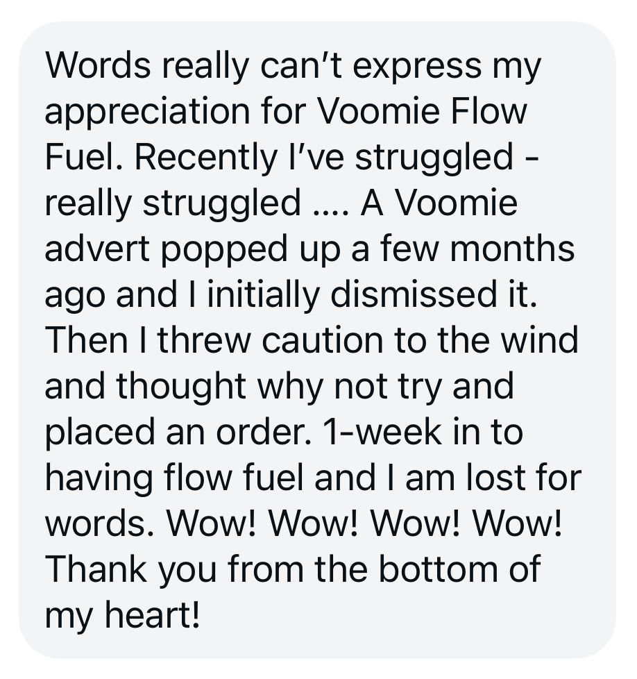 The recommended dosage of Voomie Flow Fuel is 5 grams (1 scoop), taken 1x times a day with meals or as directed. It's important to follow the instructions on the label or consult with a healthcare professional before starting any new supplement. Grab your favourite cup or bottle. Mix one 5-gram serving with water, juice, smoothies or your favourite beverage. Sip away and get in the flow for the day ahead.
