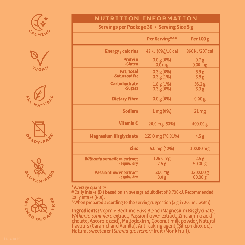 Bedtime bliss is your ideal evening treat for a peaceful night's sleep. This delicious drink is packed with quality, calming ingredients, perfect for relaxing and unwinding helping you slip into a deeper, dreamy sleep without feeling groggy the next morning.