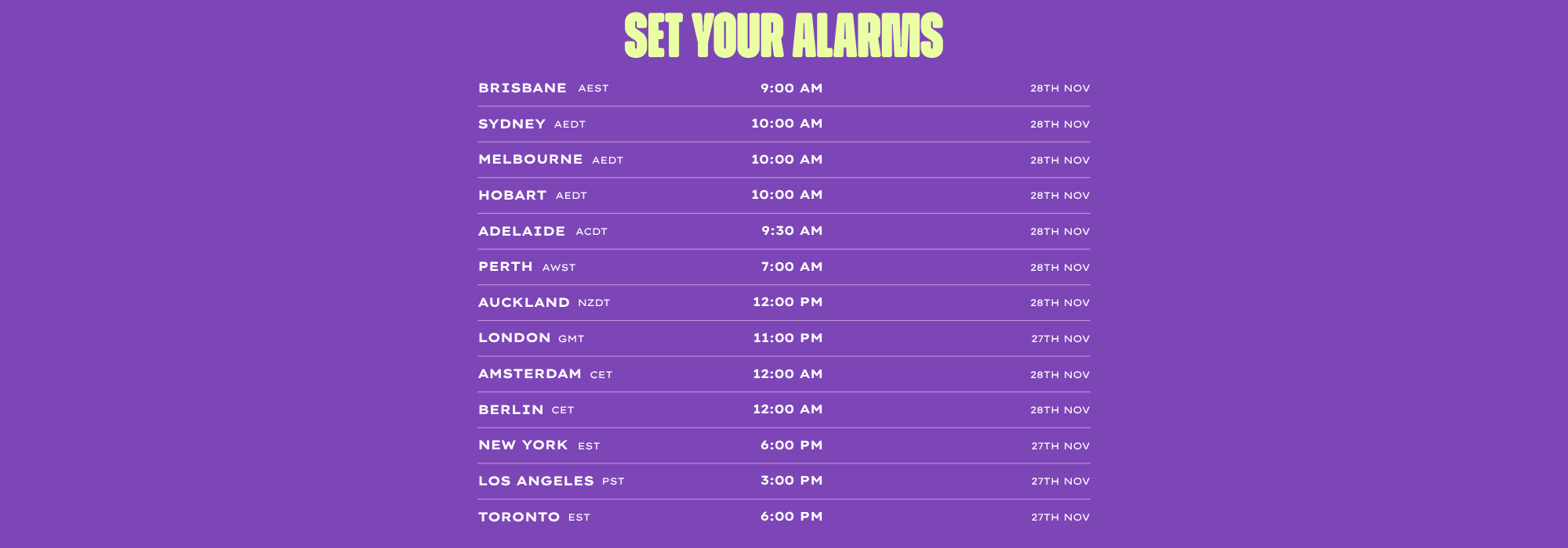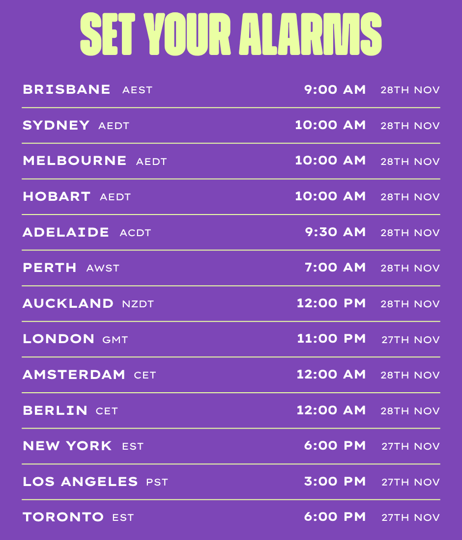 The website will be locked from Thursday 27th November at 9AM AEST until the sale starts on Friday 28th November at 9AM AEST so we can get everything ready for you to shop!