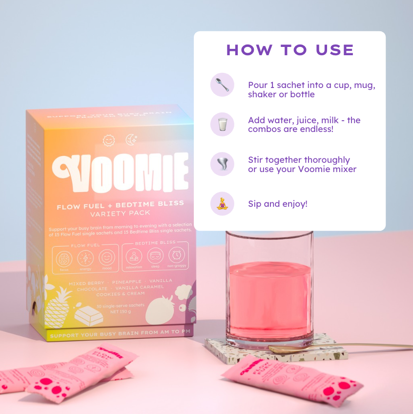The recommended dosage of Voomie Flow Fuel is 1x sachet, taken 1x times a day as directed. It's important to follow the instructions on the label or consult with a healthcare professional before starting any new supplement. Grab your favourite cup or bottle. Mix one sachet serving with water, juice, smoothies or your favourite beverage. Sip away and get in the flow for the day ahead.