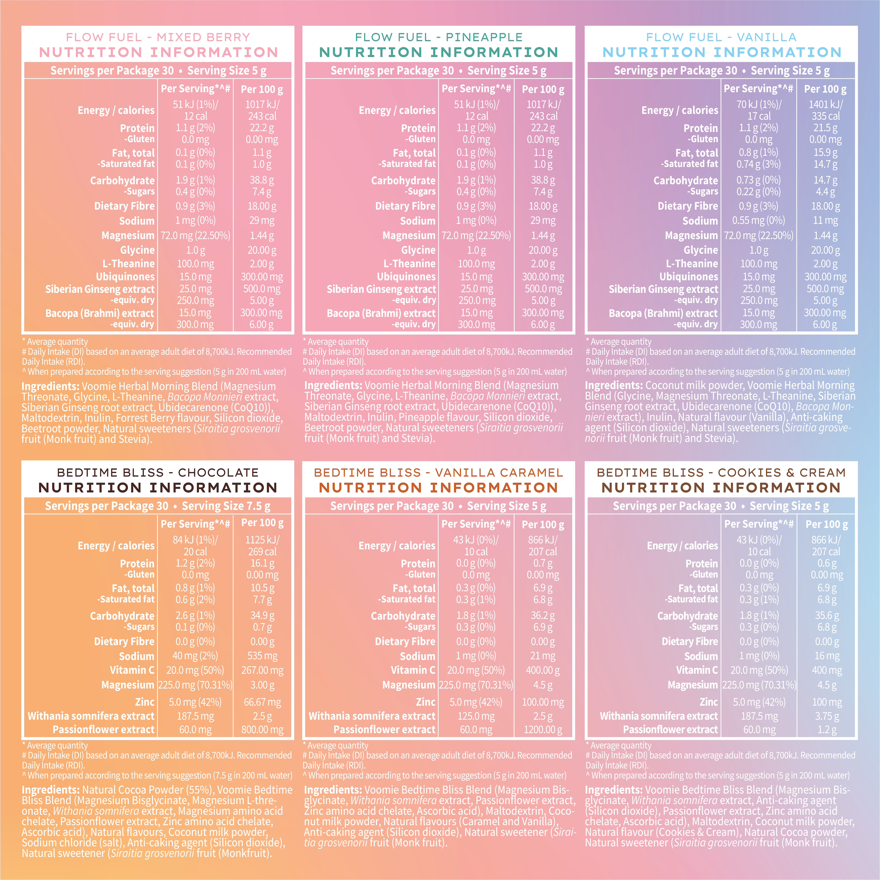 Please note the Bedtime Bliss Chocolate sachet has a 7.5g serving size compared to the 5g serving size of the other flavours. This is due to the density of the cacao.